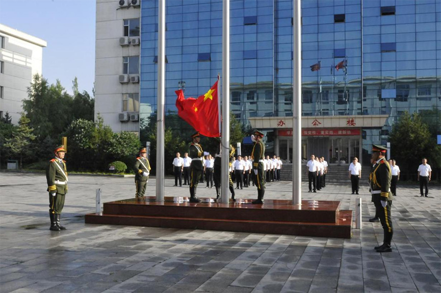 儀式中,升旗手手擎國(guó)旗,在國(guó)旗護(hù)衛(wèi)隊(duì)的護(hù)衛(wèi)下,邁著穩(wěn)健步伐登上升旗臺(tái)。在雄壯的國(guó)歌聲中,鮮艷的五星紅旗在全體人員注目下冉冉升起,迎風(fēng)飄揚(yáng)。