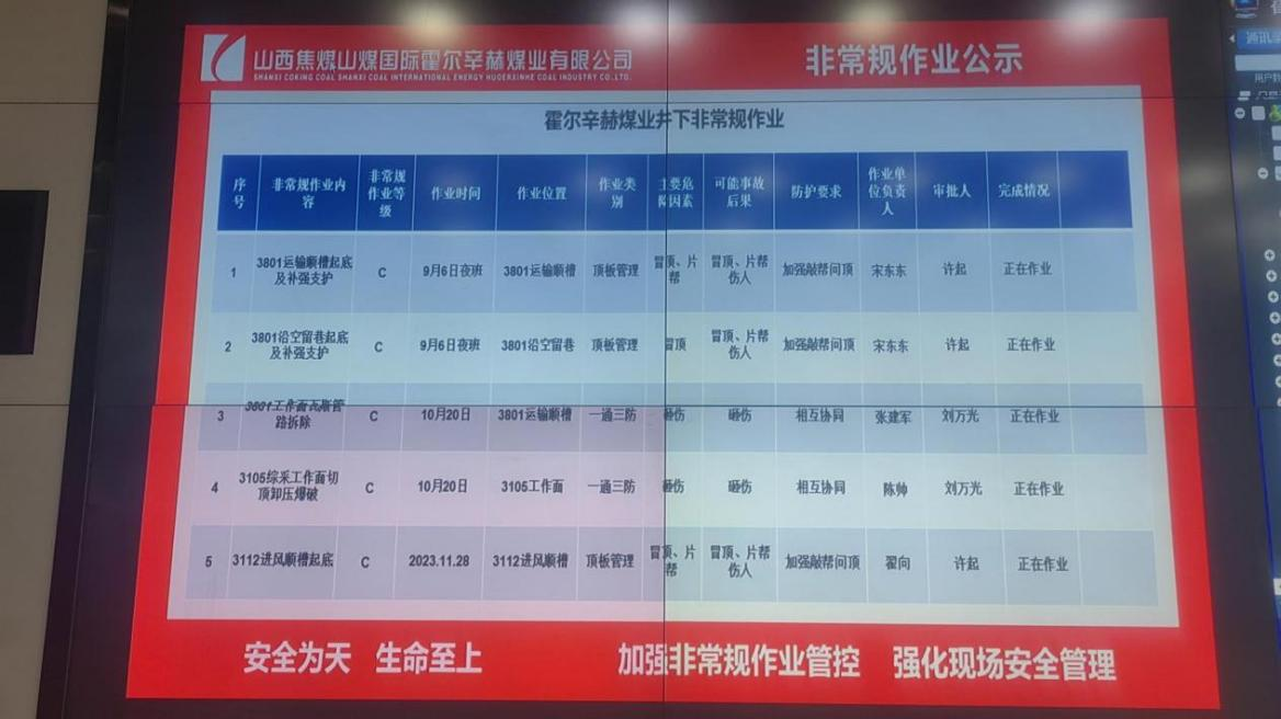 2023年以來,霍爾辛赫煤業(yè)將安全監(jiān)督作為建設(shè)“新焦煤大監(jiān)督體系”的重中之重,建立健全非常規(guī)作業(yè)安全管控管理辦法,完善安全生產(chǎn)領(lǐng)域?qū)m?xiàng)監(jiān)督措施,壓實(shí)各層級(jí)安全監(jiān)管責(zé)任,牢牢守住安全生產(chǎn)底線。